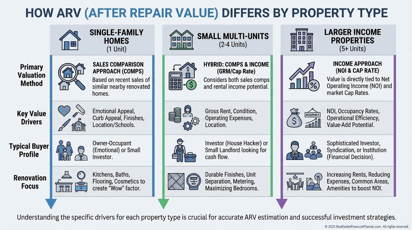 For properties with more than four units, ARV shifts from comparable sales toward income-based valuation.