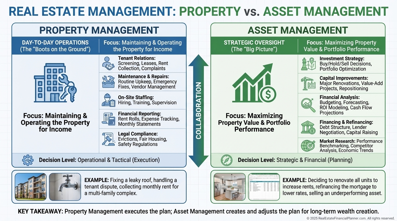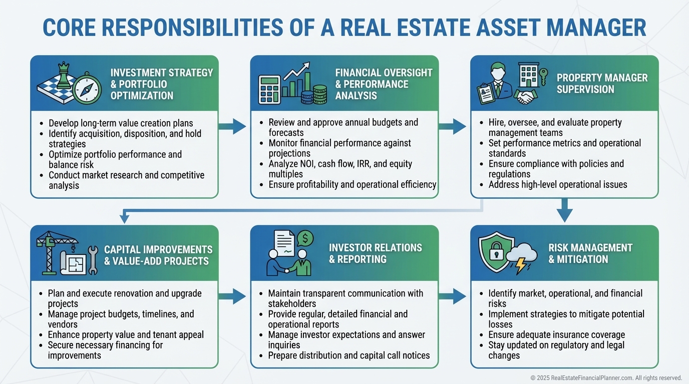 That includes strategic planning, budget oversight, refinancing decisions, supervising property managers, managing capital improvements, and communicating with investors.