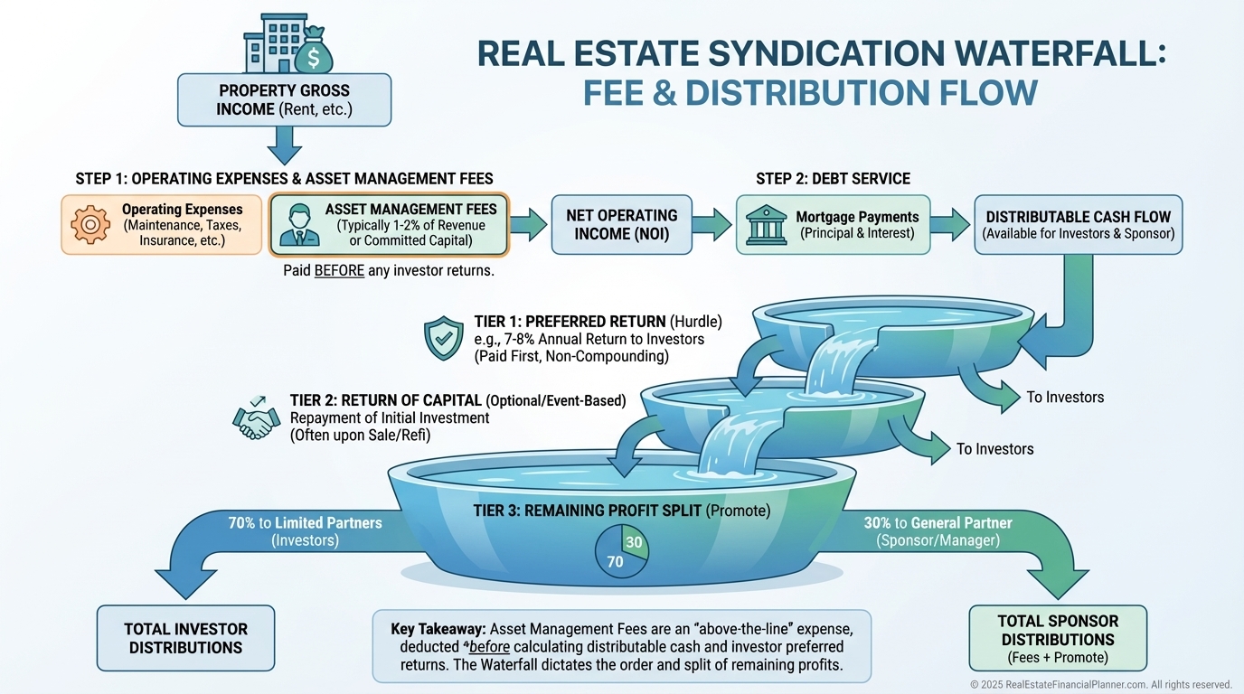 Asset management fees are typically paid before investor distributions are calculated. That means they reduce cash flow before preferred returns are considered.