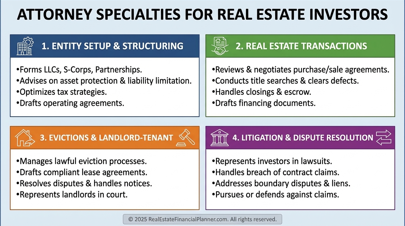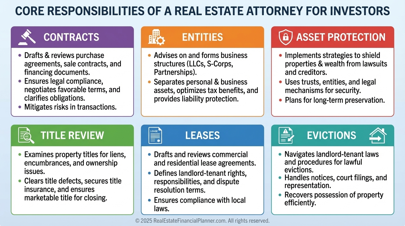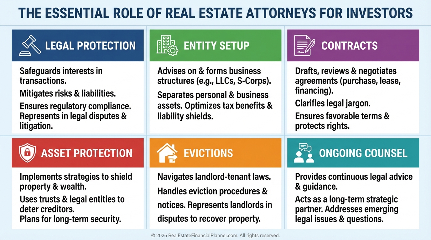 Attorneys help design the legal layers that keep a lawsuit from wiping out your portfolio.
