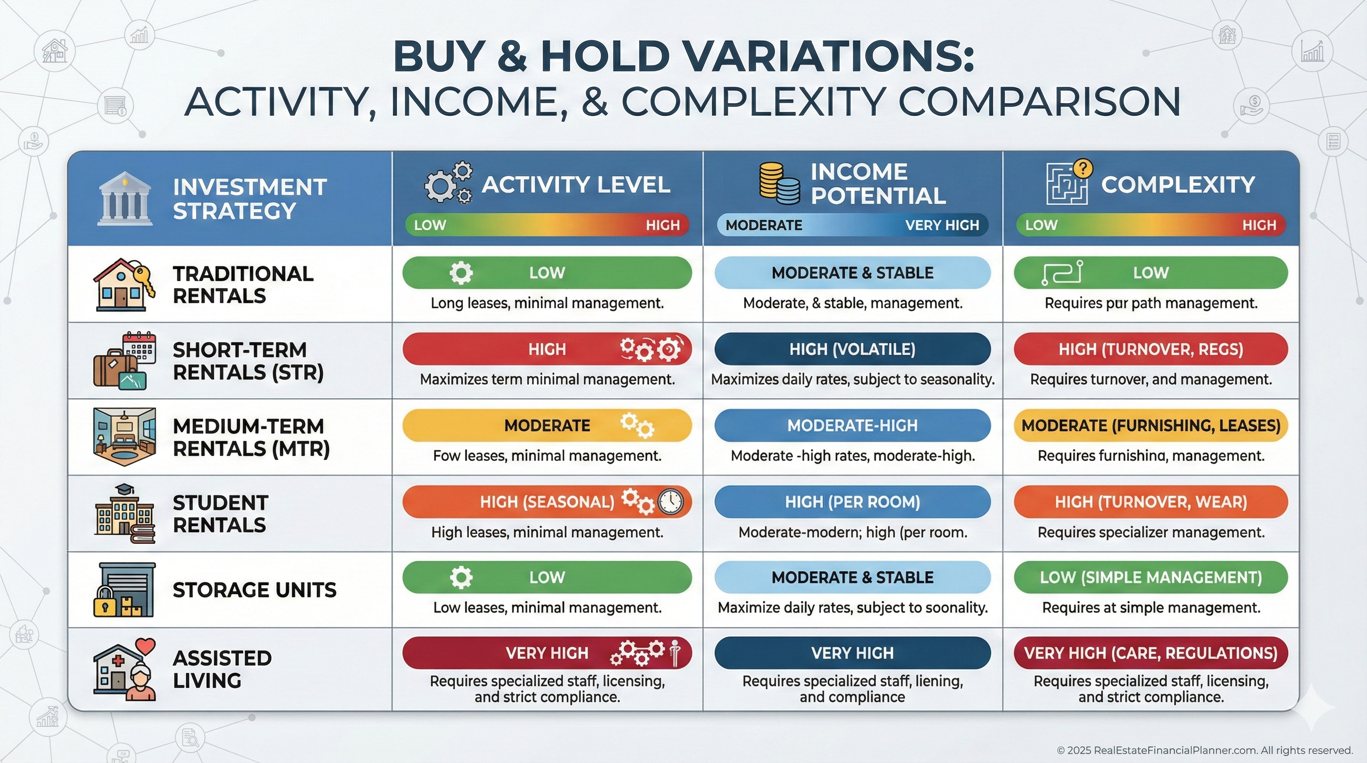 Short-Term and Vacation Rentals can produce higher income, but they behave more like a hospitality business than passive investing.