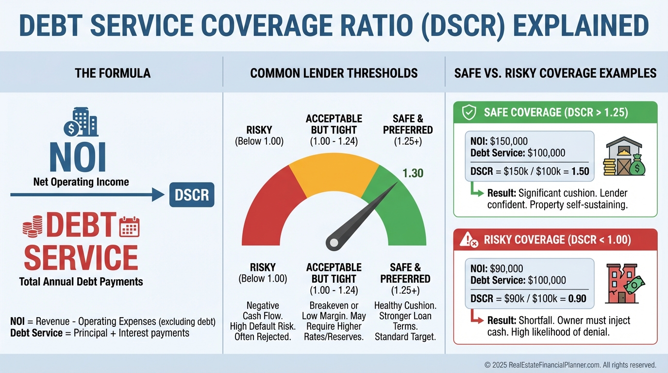 I warn clients that DSCR below 1.15 is fragile. Below 1.10 is dangerous. Below 1.00 is foreclosure math.