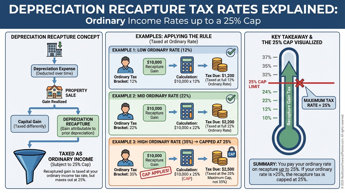 Depreciation recapture is taxed at your ordinary income rate, capped at a maximum of twenty-five percent.