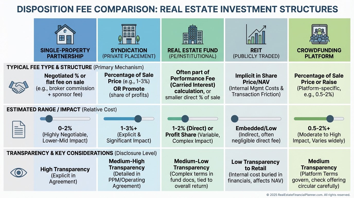 Disposition fees show up differently depending on the investment structure.