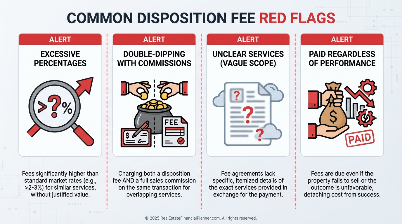 Red flags include fees above three percent with no explanation, double-dipping with full brokerage commissions, or vague language about what the fee covers.