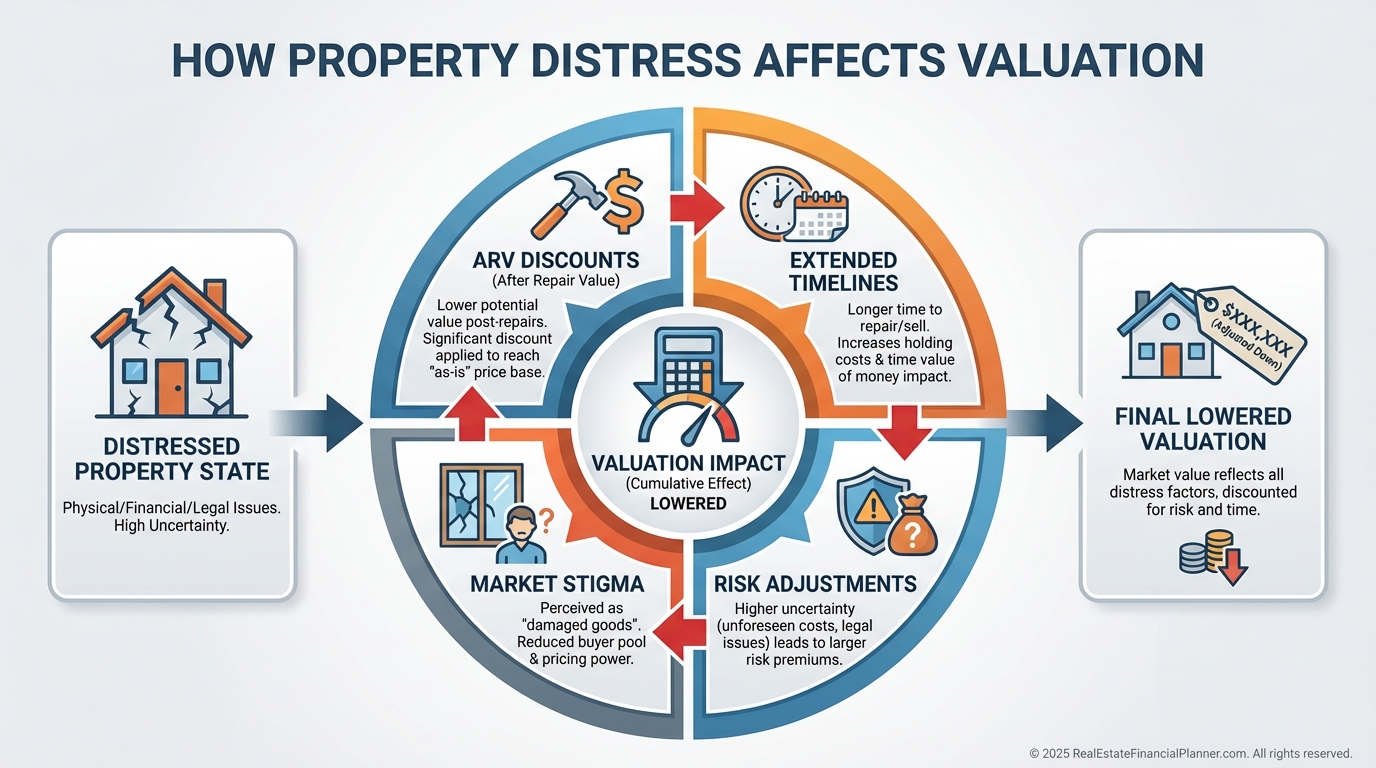 When a property scores high on multiple distress factors, deeper discounts are justified.