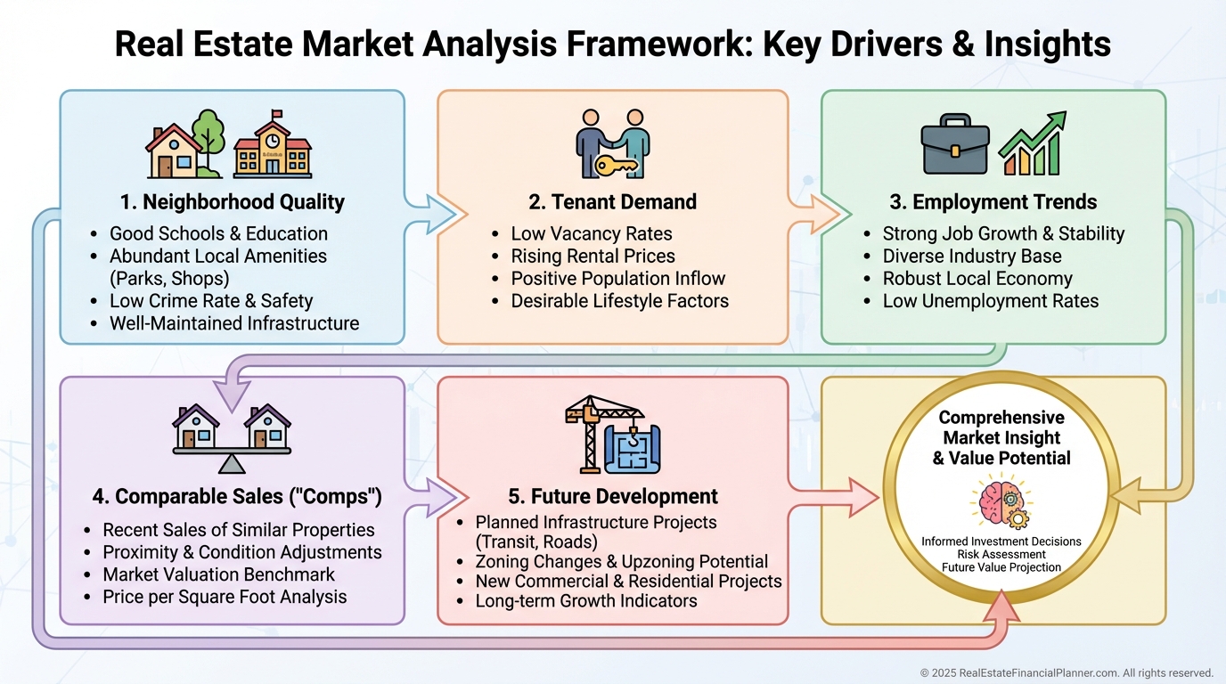 You must evaluate tenant demand, neighborhood trends, comparable values, employment drivers, and planned development.