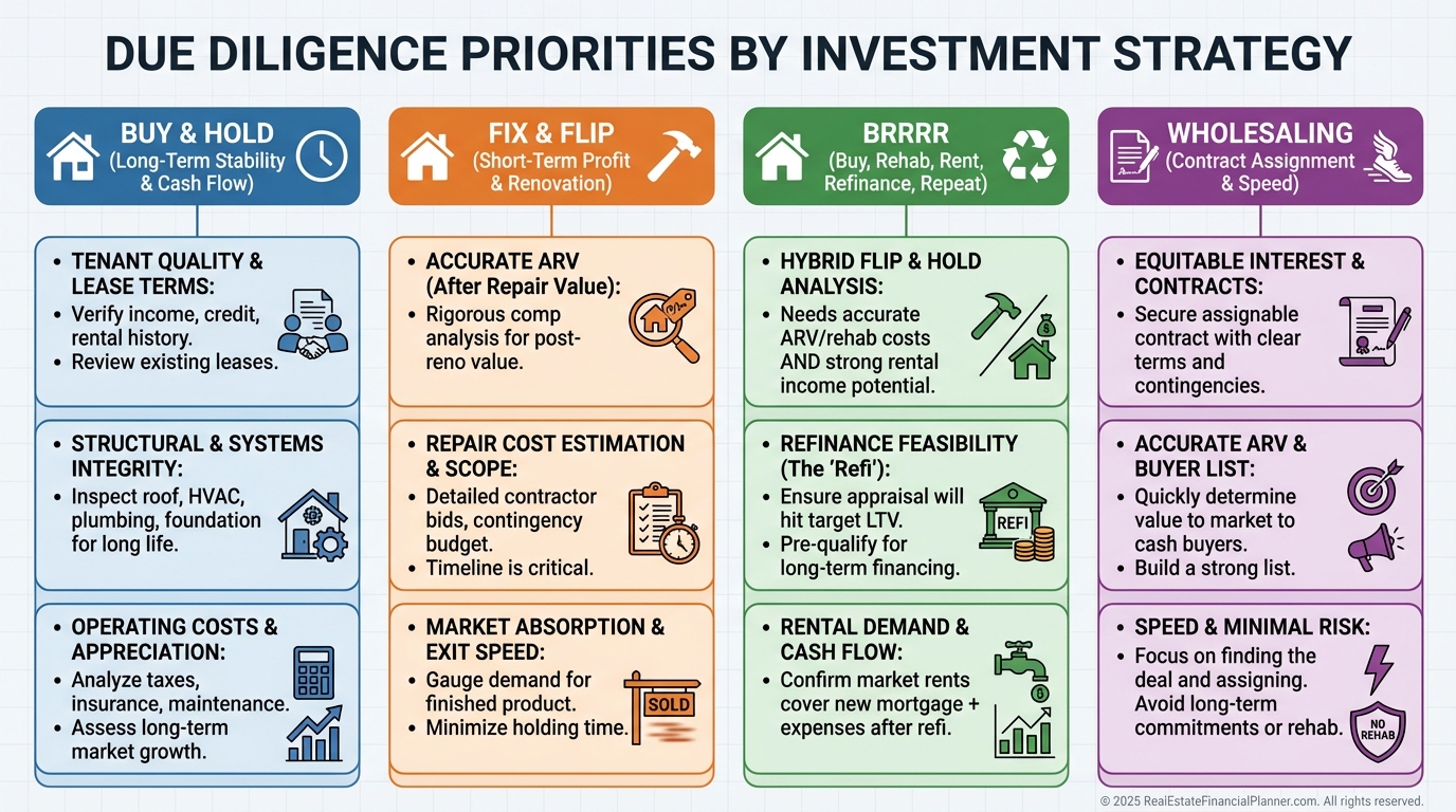 Fix-and-flip investors must validate renovation costs, ARV accuracy, contractor reliability, and absorption rates.