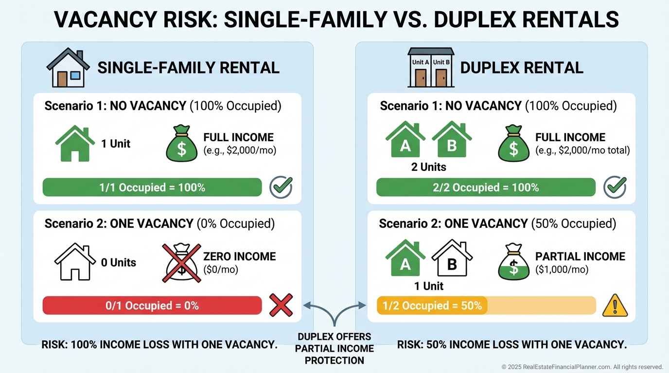 If one unit is vacant, you still collect roughly half of the property’s income. That built-in redundancy dramatically improves cash flow stability, especially in slower rental markets.