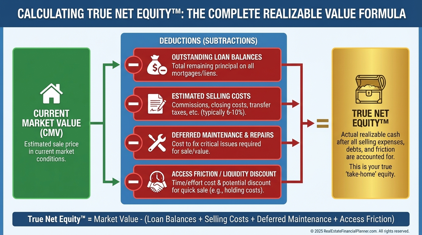 "Create a 16:9 infographic explaining how to calculate True Net Equity™, including market value, loan balances, selling costs, deferred maintenance, and access friction. Use clear labels, structured layout, and concise text. Add the text '© 2025 RealEstateFinancialPlanner.com. All rights reserved.' in a subtle position."