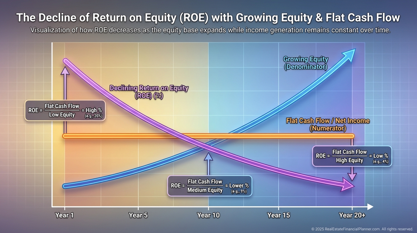 "Create a 16:9 infographic showing how Return on Equity (ROE) declines over time as equity grows while cash flow remains flat. Use a timeline or curve visualization with clear labels. Add the text '© 2025 RealEstateFinancialPlanner.com. All rights reserved.' in a subtle position."