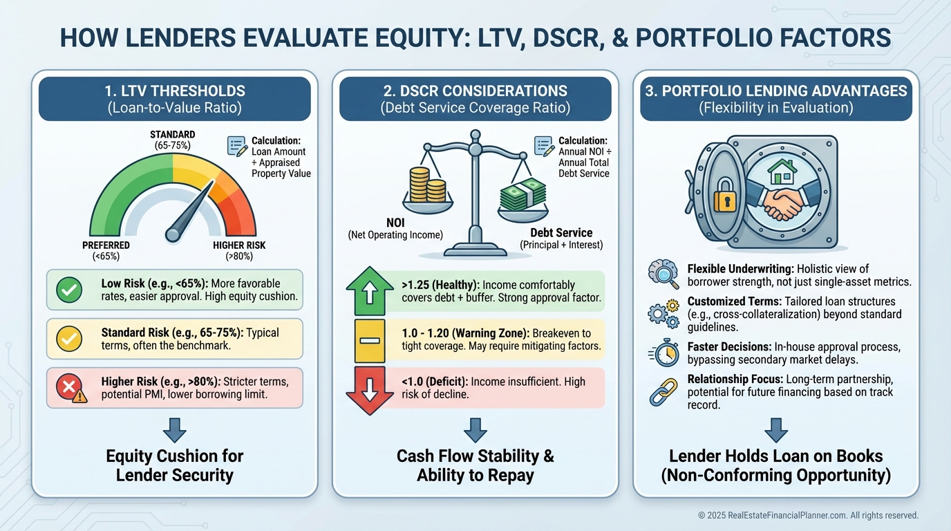 "Create a 16:9 infographic showing how lenders evaluate equity, including LTV thresholds, DSCR considerations, and portfolio lending advantages. Use clear labels and structured sections. Add the text '© 2025 RealEstateFinancialPlanner.com. All rights reserved.' in a subtle position."