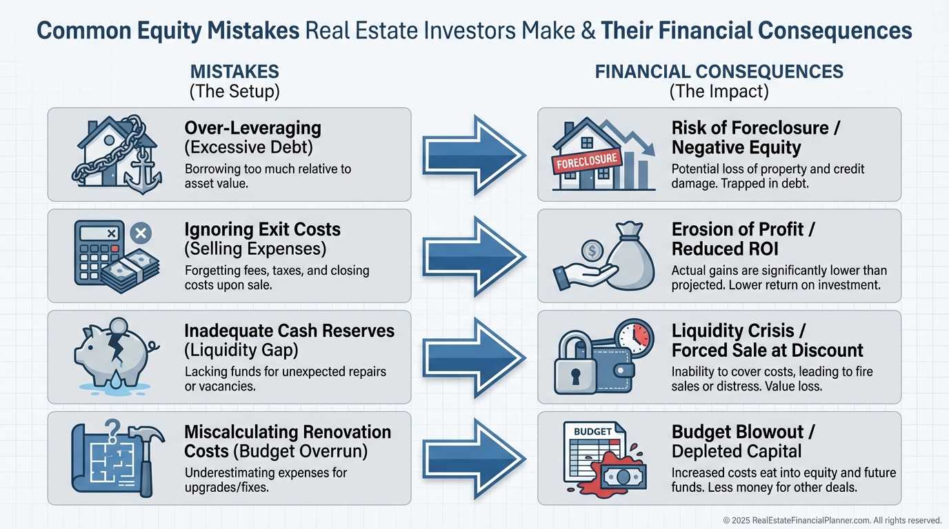 "Create a 16:9 infographic outlining the most common equity mistakes real estate investors make and the financial consequences of each. Use icons, concise labels, and a clean layout. Add the text '© 2025 RealEstateFinancialPlanner.com. All rights reserved.' in a subtle position."