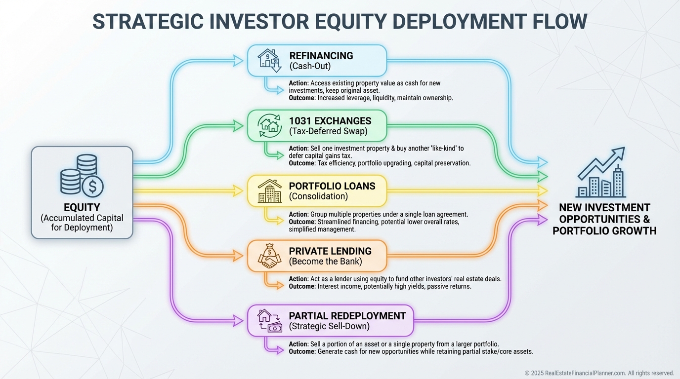 "Create a 16:9 infographic showing strategic ways investors deploy equity, including refinancing, 1031 exchanges, portfolio loans, private lending, and partial redeployment. Use a decision-tree or flow layout. Add the text '© 2025 RealEstateFinancialPlanner.com. All rights reserved.' in a subtle position."