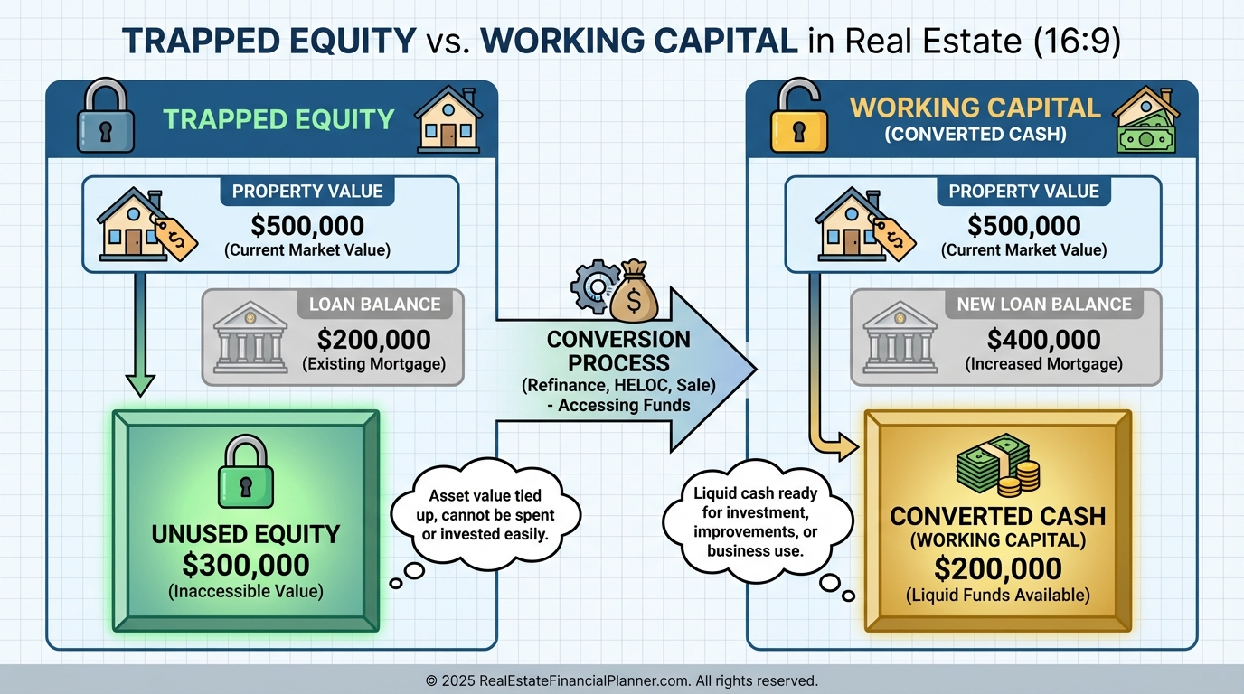 A $500,000 property with a $200,000 loan has $300,000 in equity, but that equity cannot fund another purchase, cover emergencies, or rebalance risk.