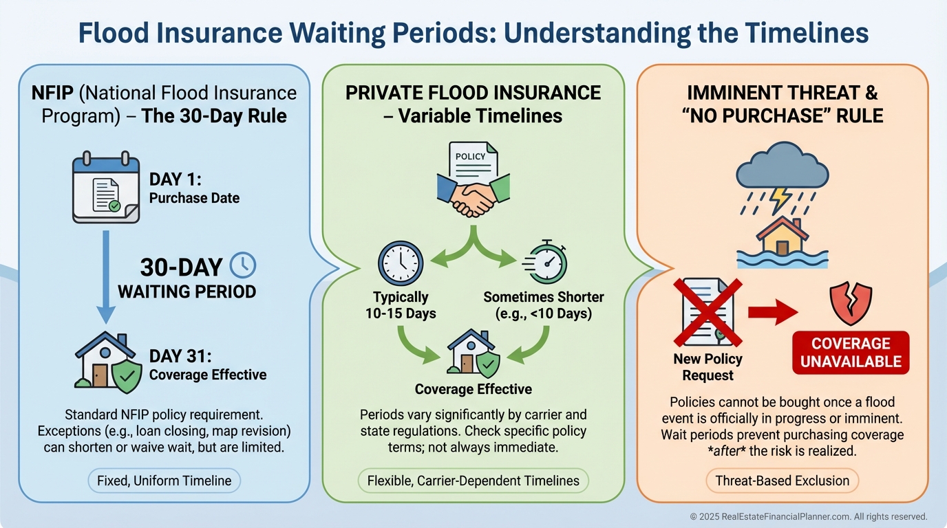Most private flood insurers still require 10 to 14 days before coverage begins.