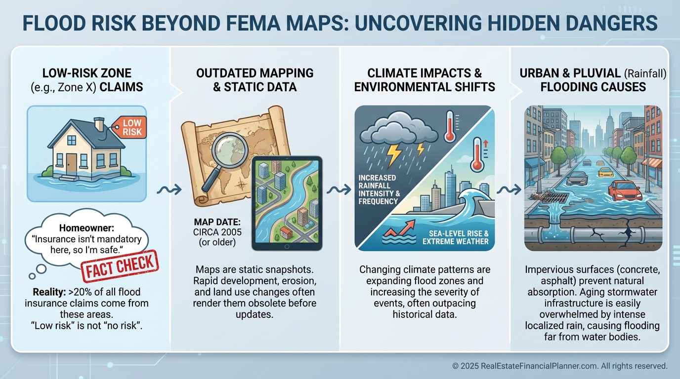 If your analysis assumes “this area has never flooded,” you are betting your equity on the past repeating itself.