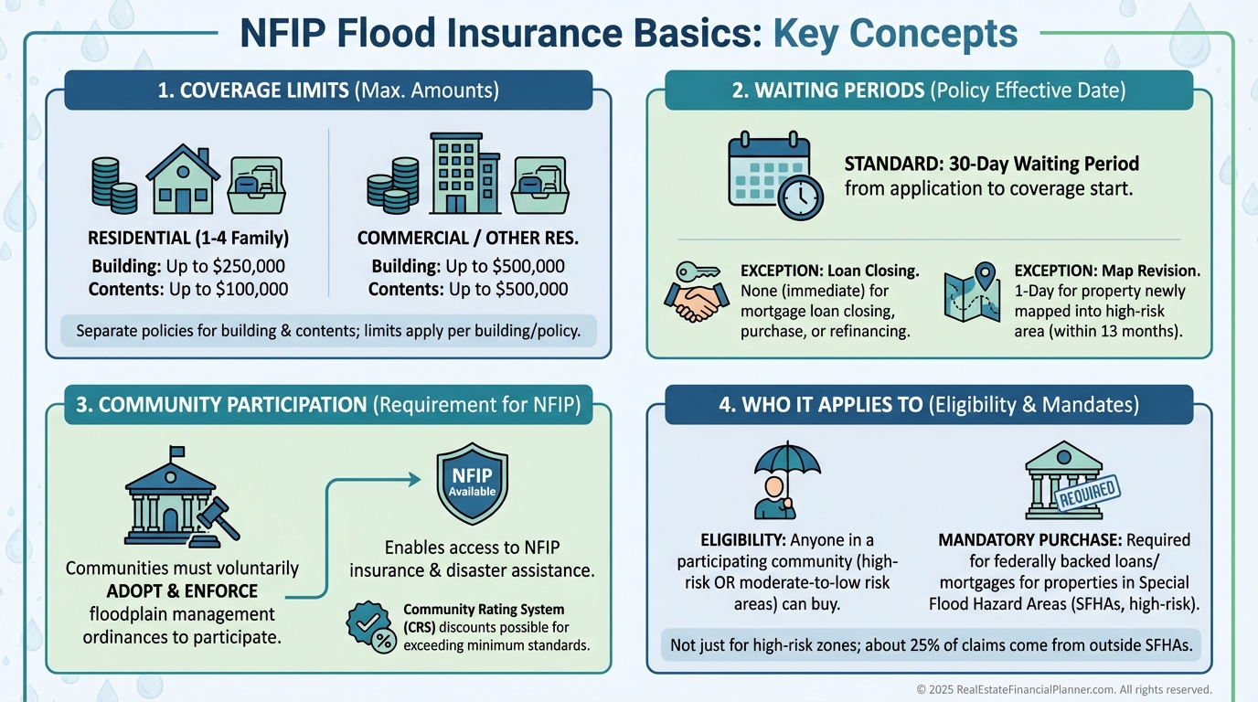 The National Flood Insurance Program enforces a standard 30-day waiting period.