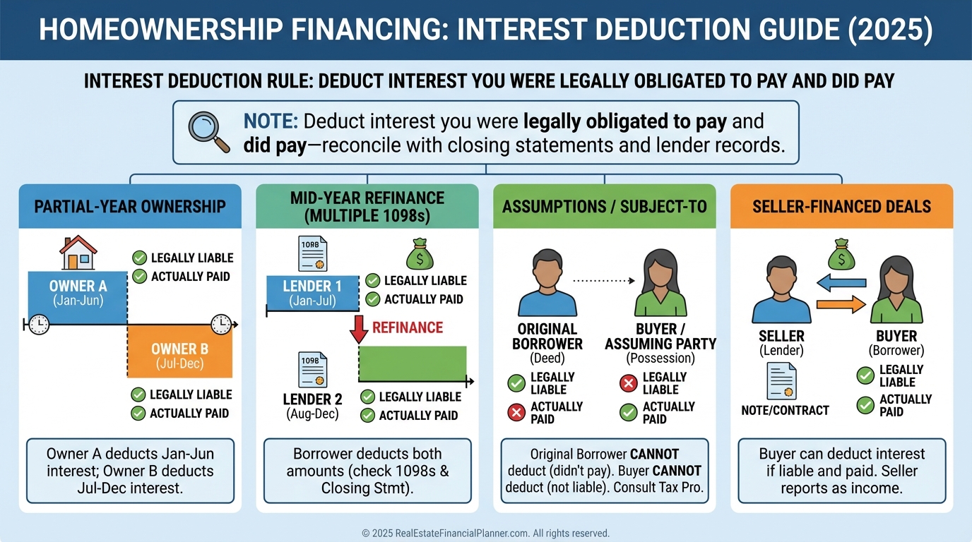 You can still deduct the interest you paid if you were liable; nominee reporting or additional statements may be required. Coordinate with a CPA early.