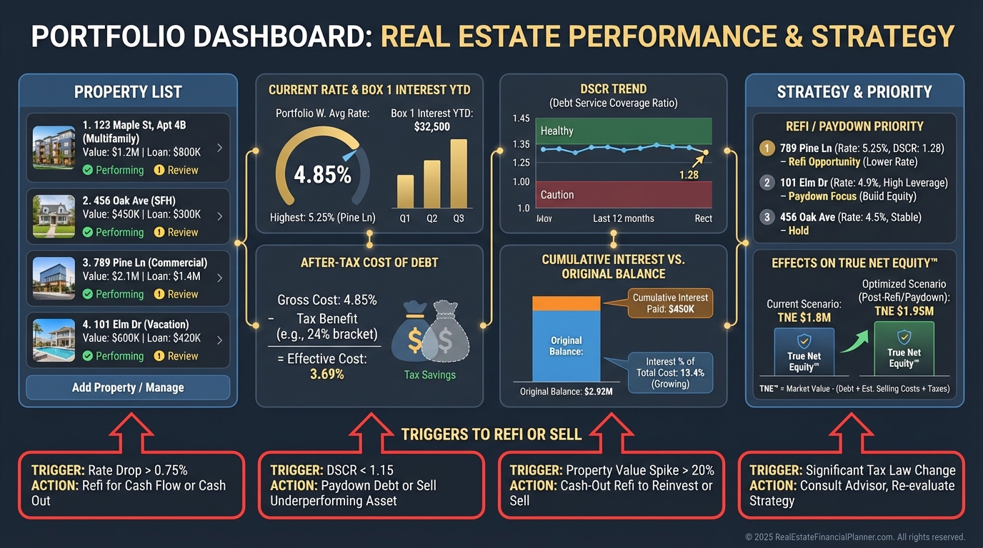 When it approaches 20–30% of the original balance, I reassess whether a refi, rate-term change, or payoff improves Return Quadrants™ outcomes.