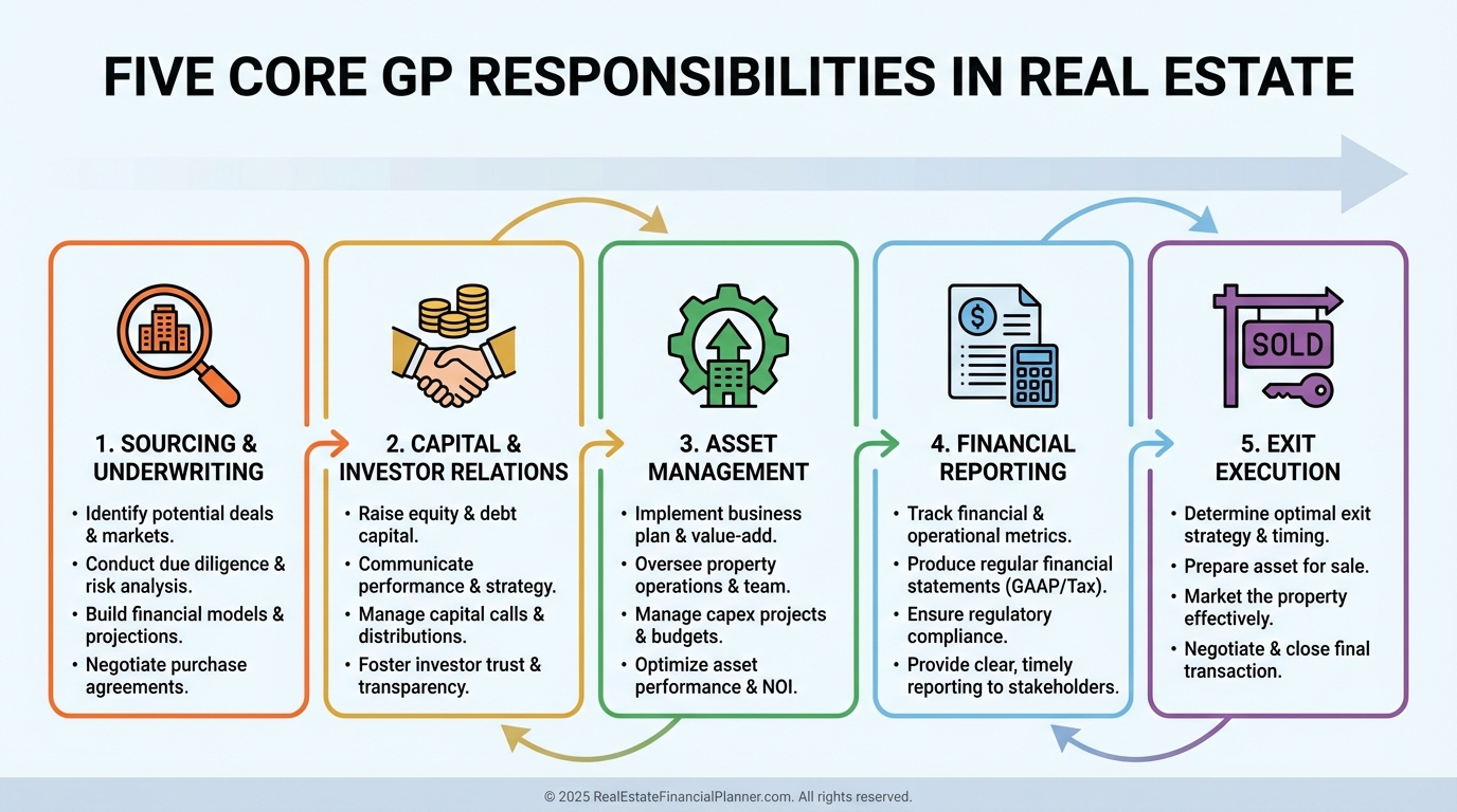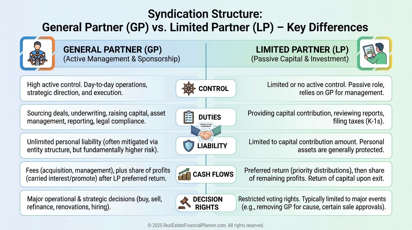 A General Partner (GP) leads the syndication, makes decisions, signs on debt, and carries the operational burden.