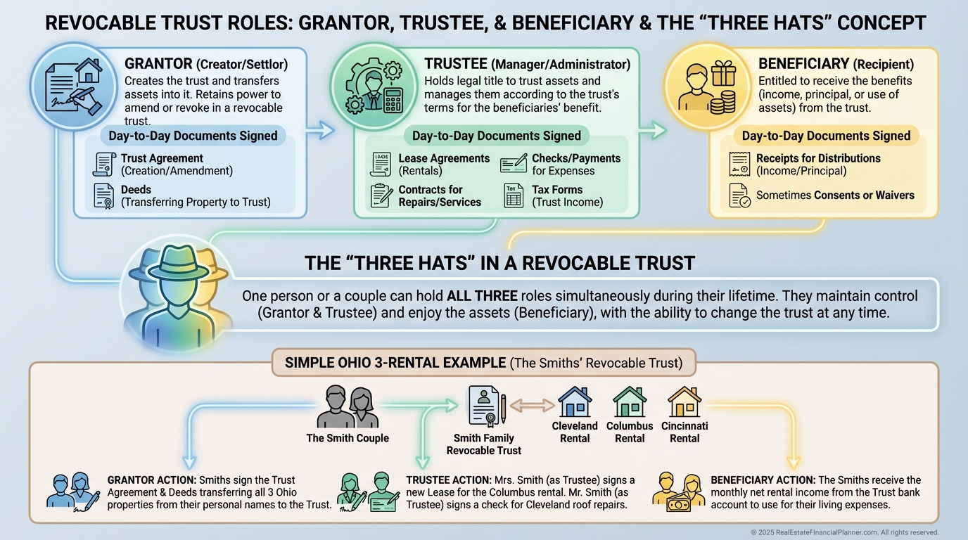 In practice, I often see couples serve as co-grantors, co-trustees, and primary beneficiaries, keeping full operational control with documented authority.