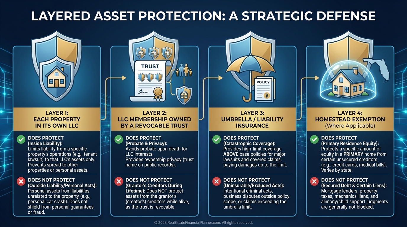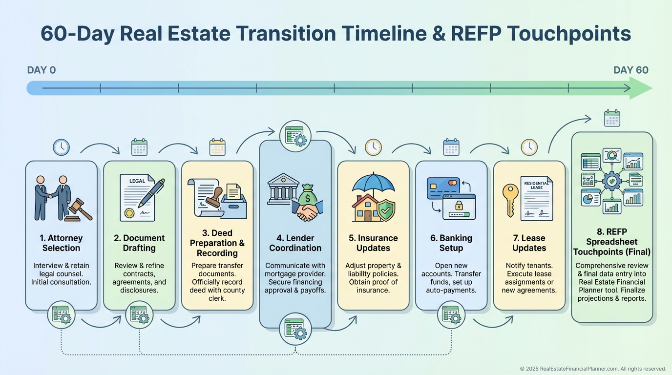 Week 1–2: Inventory properties, loans, insurance, and beneficiaries, then choose structure with an attorney who understands both real estate and estate planning.