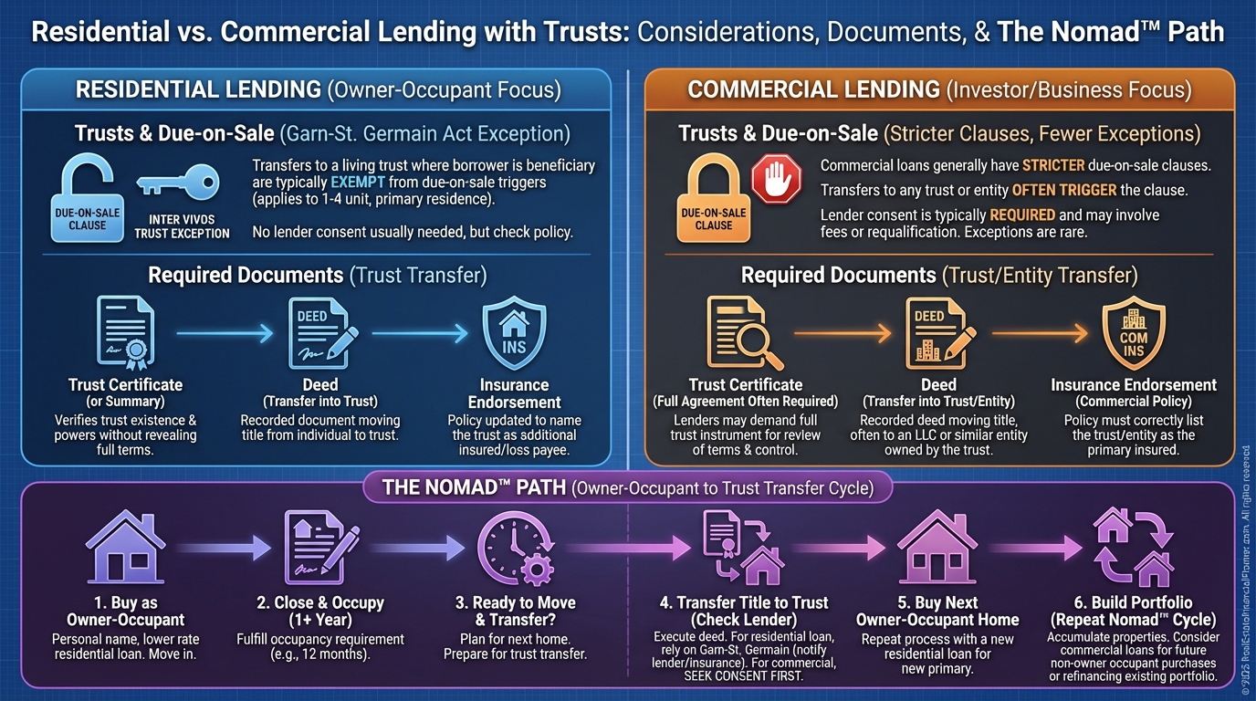For Nomad™ investors, I close as owner-occupant to get best terms, season the loan as required, then deed to the revocable trust with lender notice.