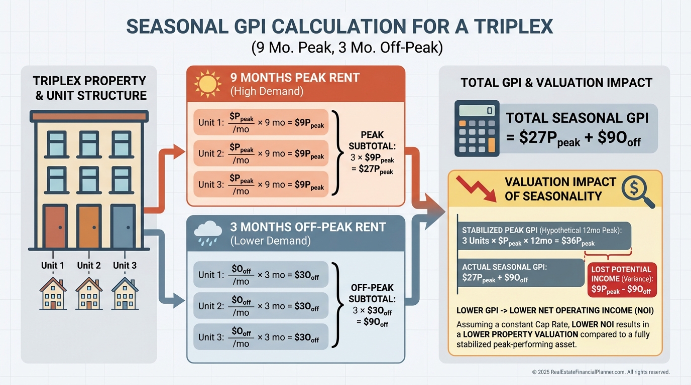 If units rent at $1,250 for nine months and $800 for three, annual per-unit GPI is 1,250×9 + 800×3 = $13,050.