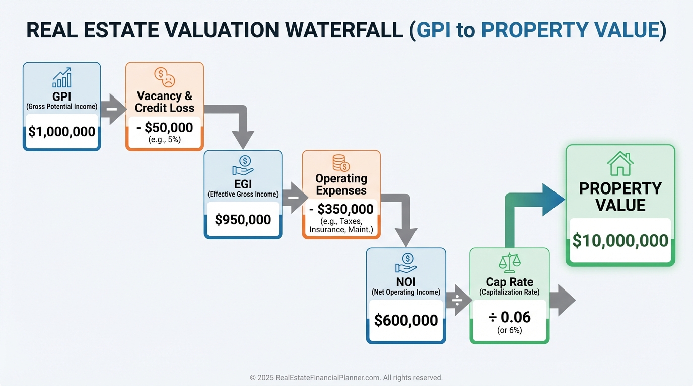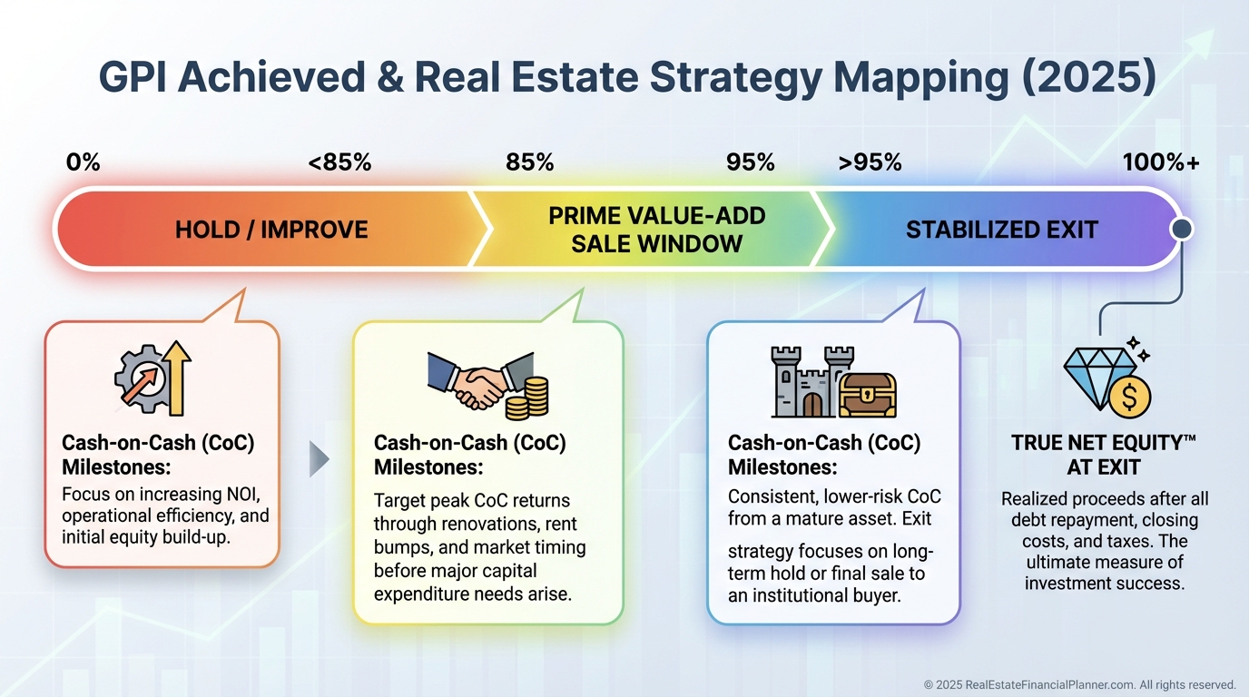 When I coach clients, we build a pro forma path from today’s income to stabilized GPI and map the cash-on-cash turning points.