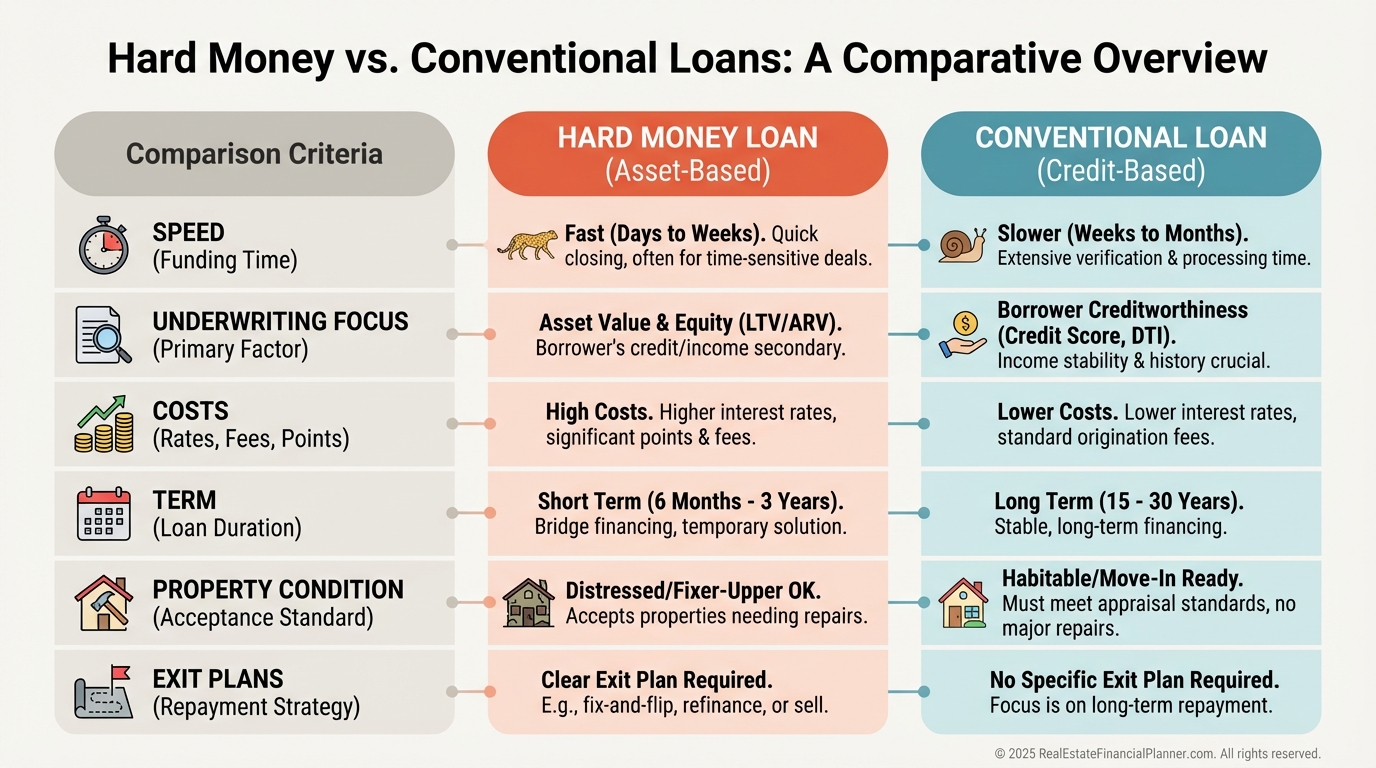 Use hard money when property condition disqualifies conventional loans, timelines are tight, or you need draw-based rehab funding.