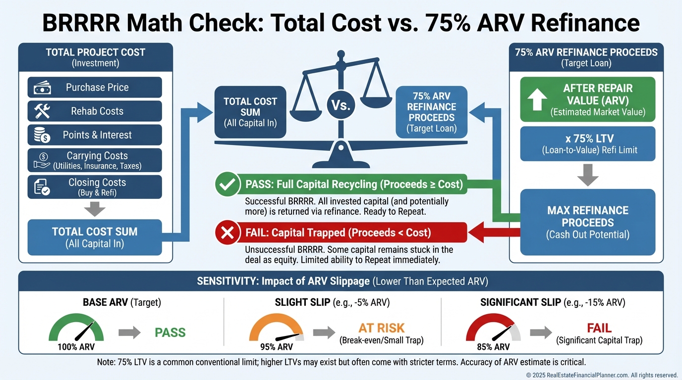 For a typical 75% LTV refinance, your all-in cost must be below 75% of ARV after counting every dollar you’ll spend.