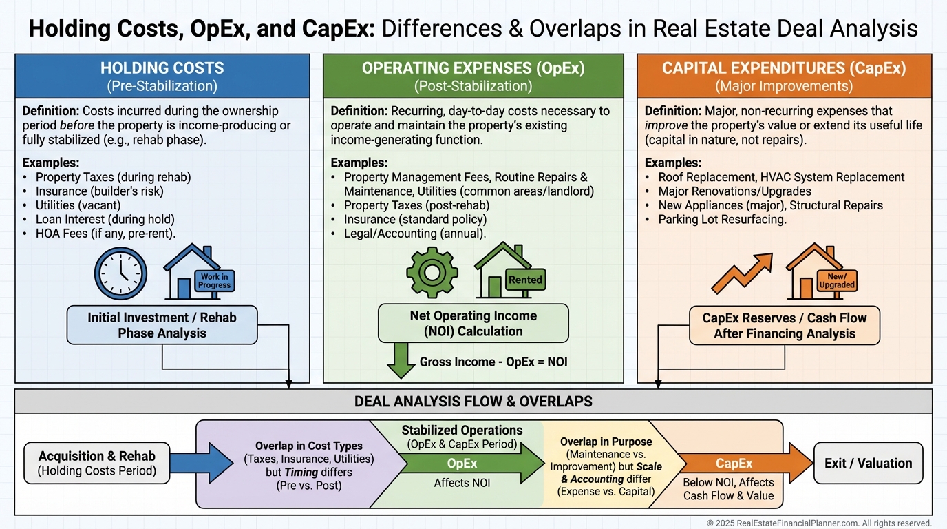 Holding costs are every expense you incur from the day you close until the property is sold or stabilized.