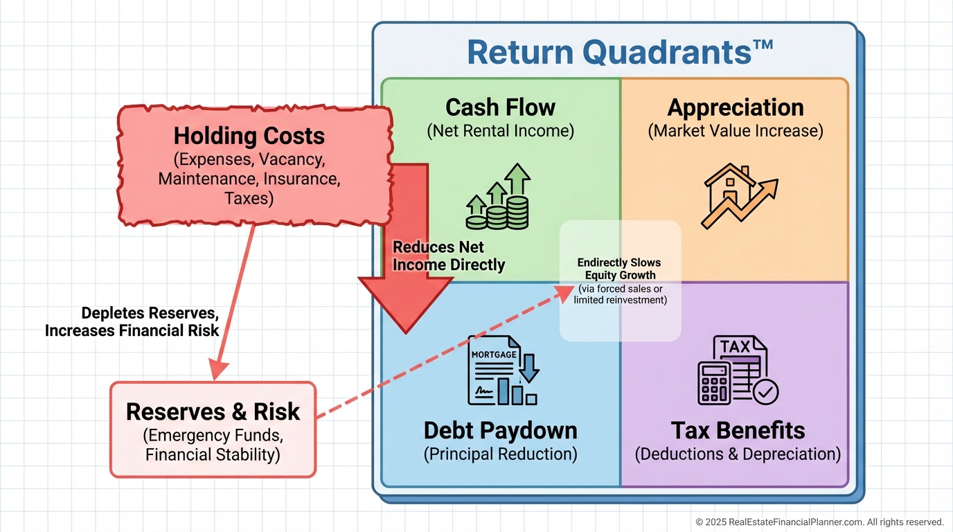 On the Return Quadrants™, holding costs drag cash flow today and can force capital calls that bleed True Net Equity™ tomorrow.
