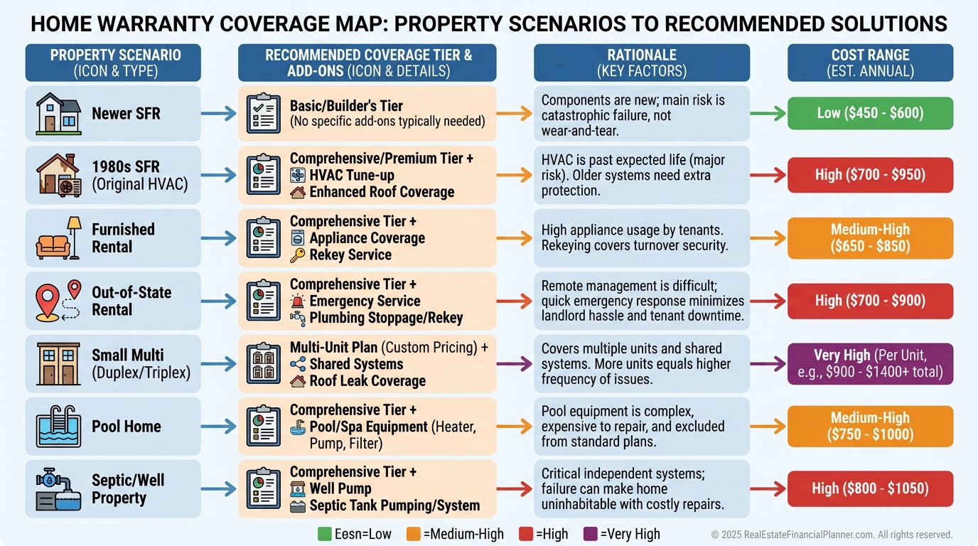 Comprehensive plans add appliances. They shine for furnished rentals or properties where you supply the kitchen and laundry.