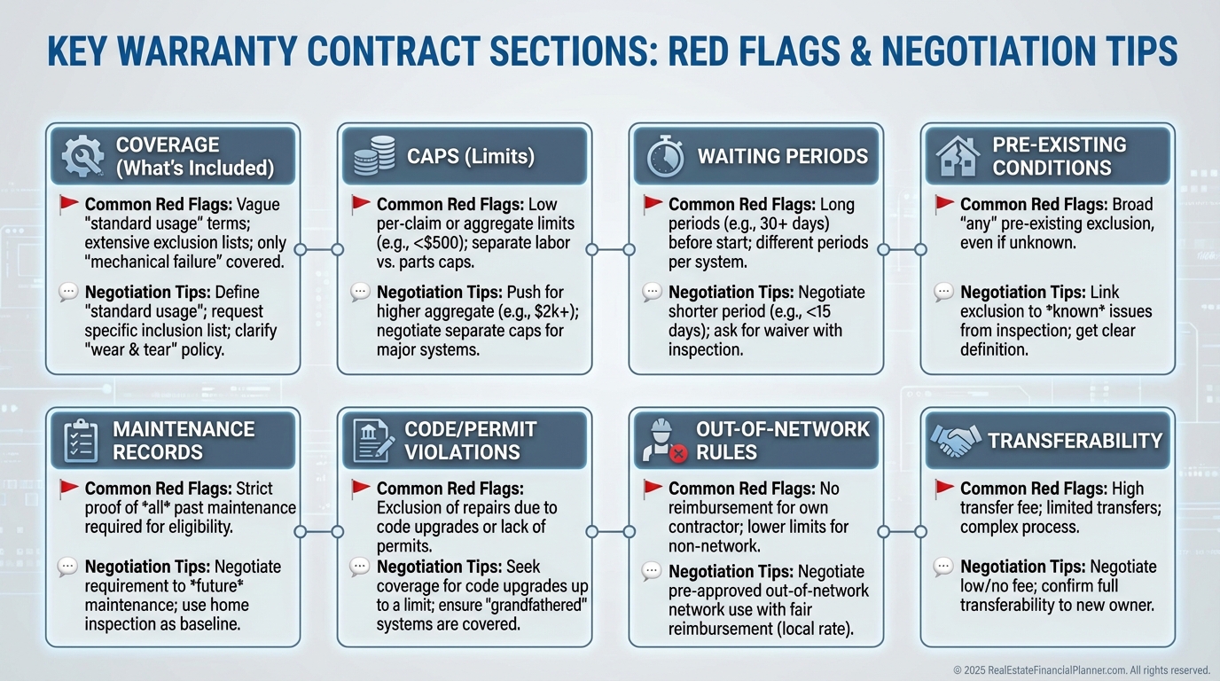 Coverage is real, but caps and exclusions are real too. Most plans cap per-item payouts and exclude code upgrades, improper installs, lack of maintenance, and cosmetic issues.