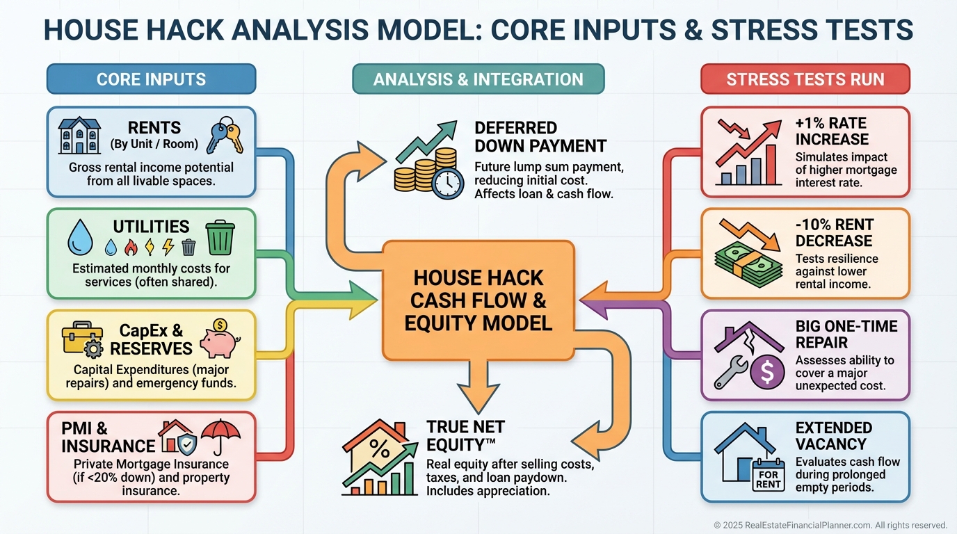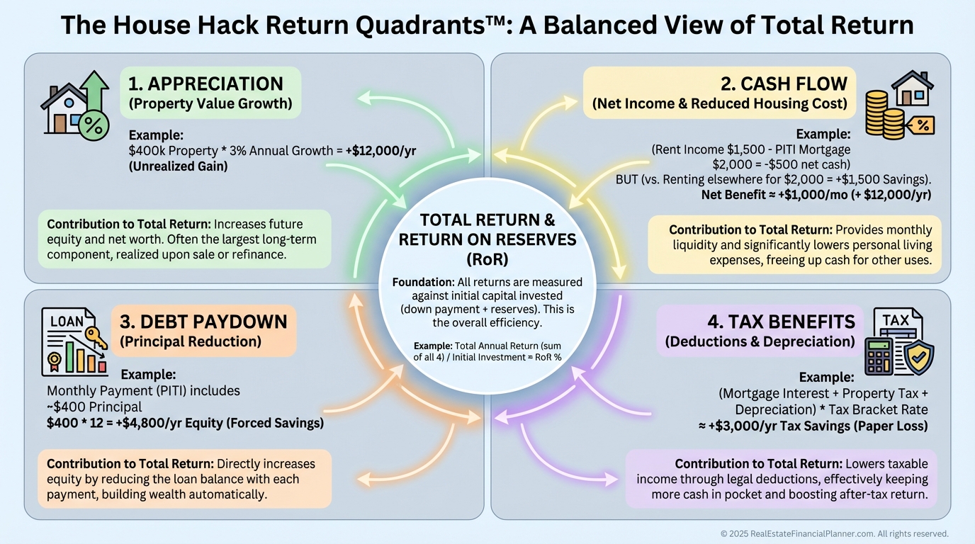 House hacking taps all four Return Quadrants™—Appreciation, Cash Flow (including reduced housing cost), Debt Paydown, and Tax Benefits—plus a modest return on your Reserves.