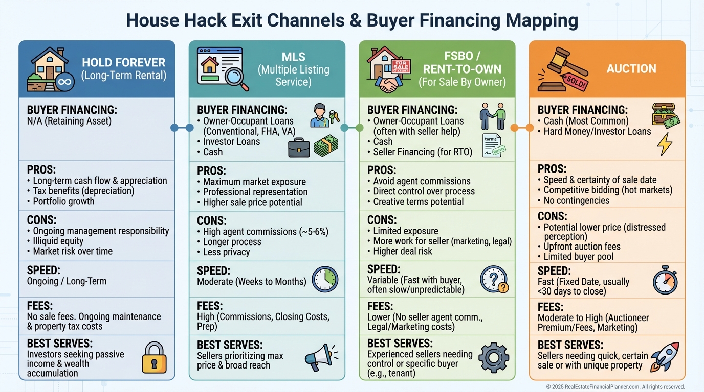 Common exit paths include listing on the MLS, selling FSBO or as a rent-to-own, and occasionally auction. Many simply hold forever.