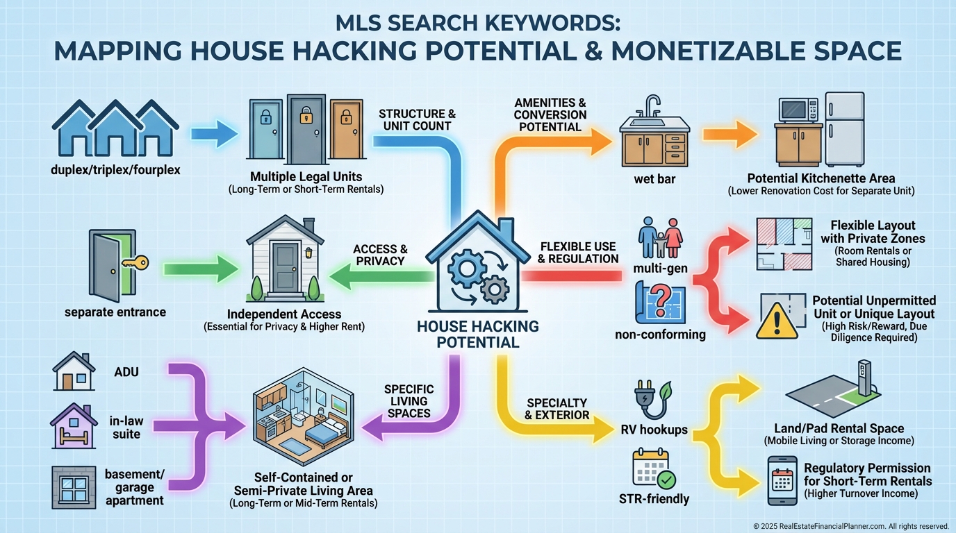 Search terms that often reveal hidden house hacks: duplex/triplex/fourplex, ADU, in-law suite, separate entrance, basement/garage apartment, wet bar, multi-gen, non-conforming (for roommates), RV hookups, and STR-friendly wording.