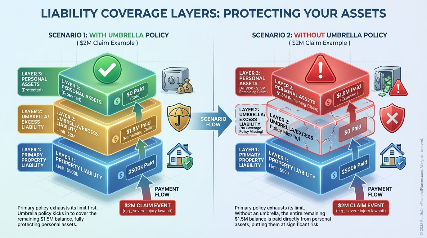 Umbrella coverage is excess liability that sits above your home, rentals, and auto.