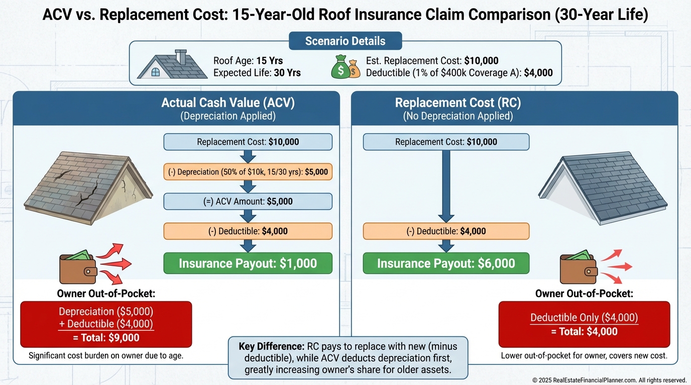 Actual Cash Value (ACV) pays depreciated value, which can be far short of replacement.