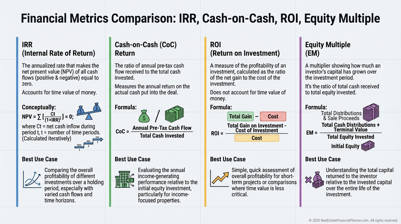 When I underwrite, I start with IRR because it captures magnitude, timing, and exit.