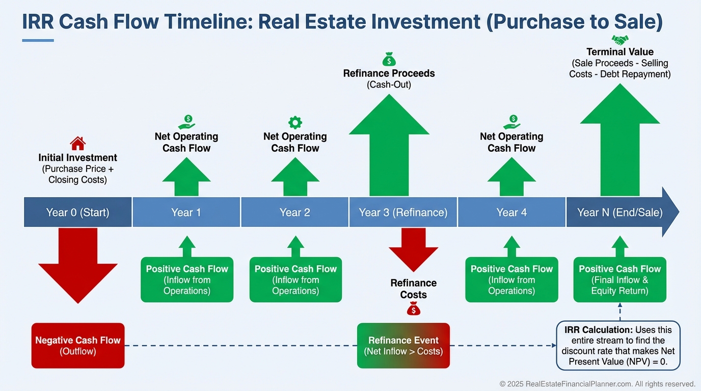 IRR forces you to model refinance proceeds, capital calls, balloon payments, and sale costs. That’s real life.