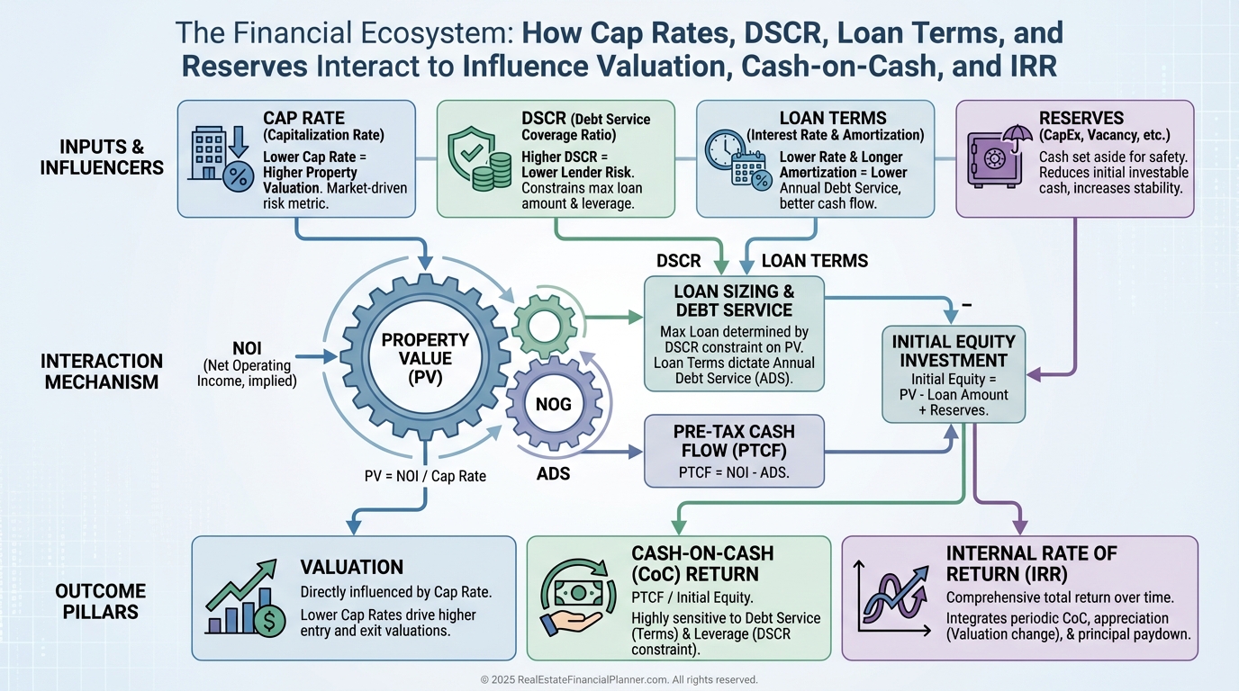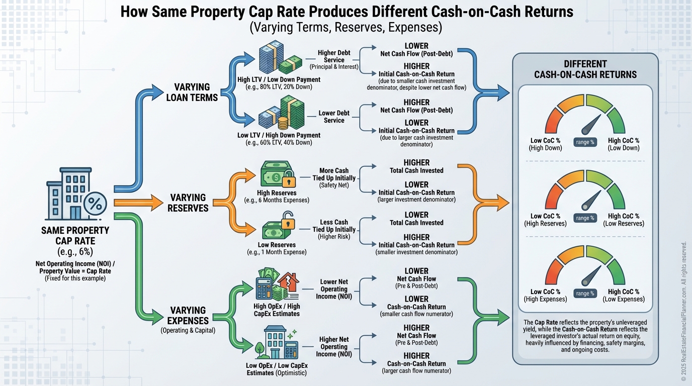Cap rate is a property metric. Cash-on-cash is an investor metric. Leverage and loan terms bridge the gap between them.
