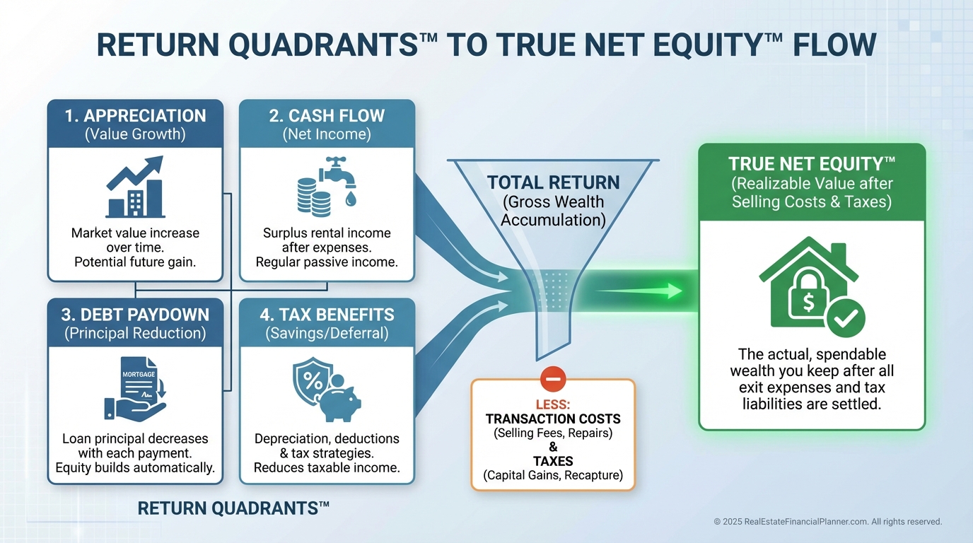 Return Quadrants™ breaks down where your returns come from: appreciation, cash flow, debt paydown, and tax benefits.