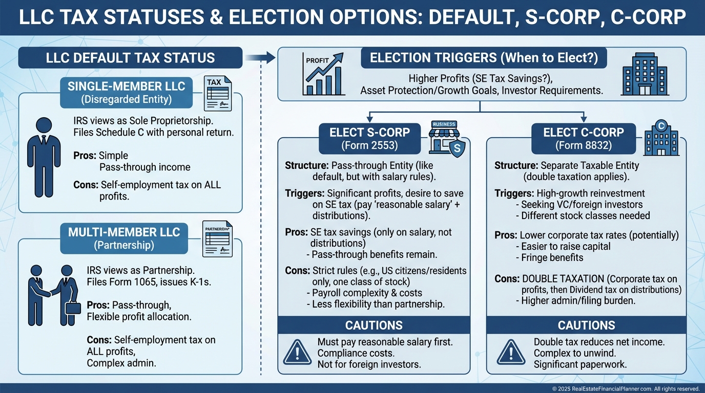 Default pass-through status preserves depreciation and expense deductions, while elective S-Corp or C-Corp treatment can optimize specific income streams.