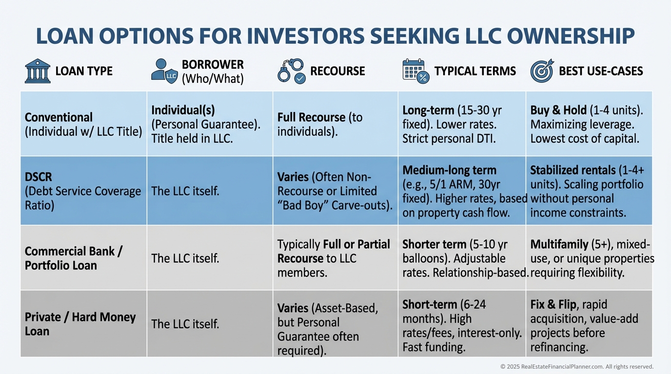 If you plan to own in an LLC, ask your lender about DSCR, portfolio, or commercial options from day one.