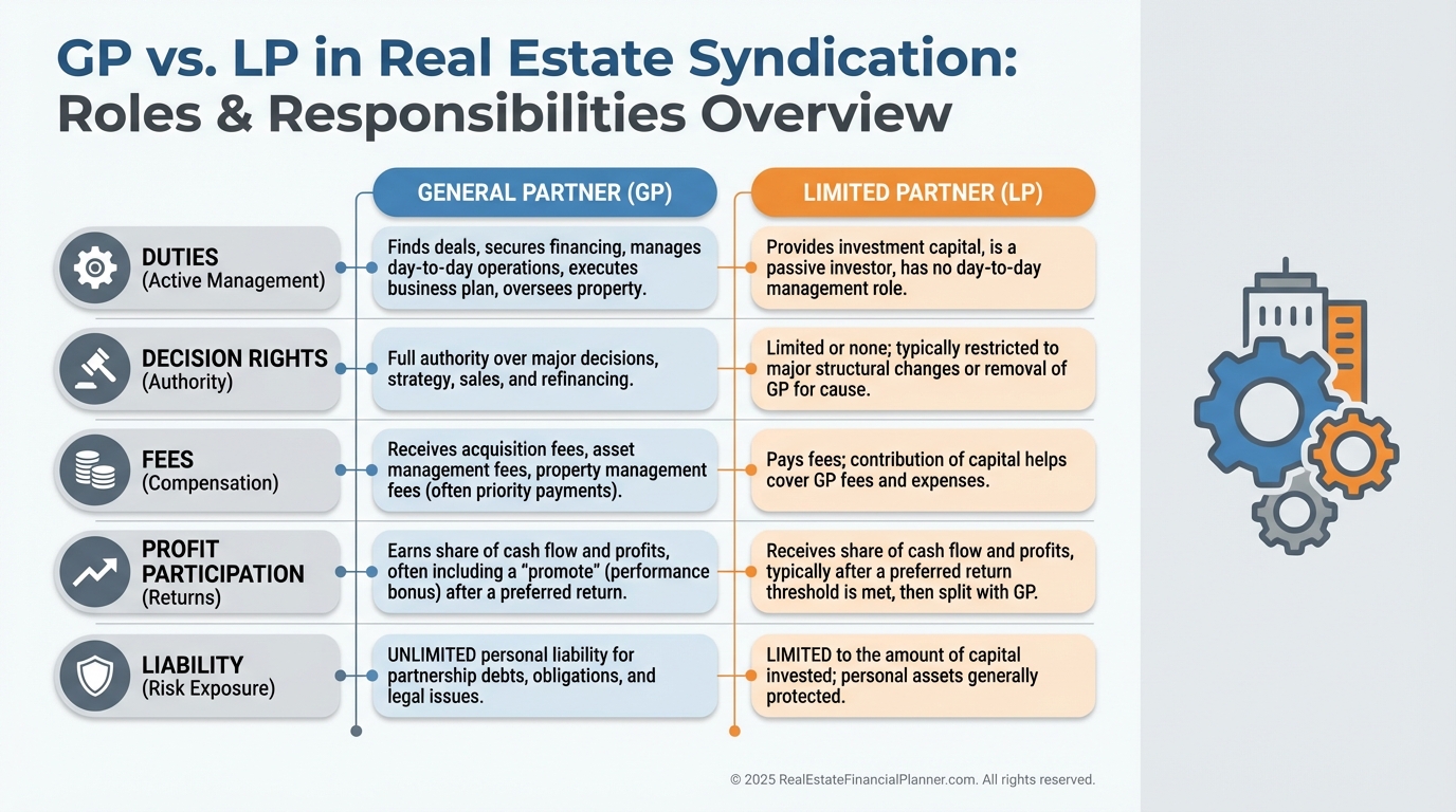 The GP finds the deal, arranges financing, oversees renovations, and makes decisions. The GP also carries the management duty and liability.