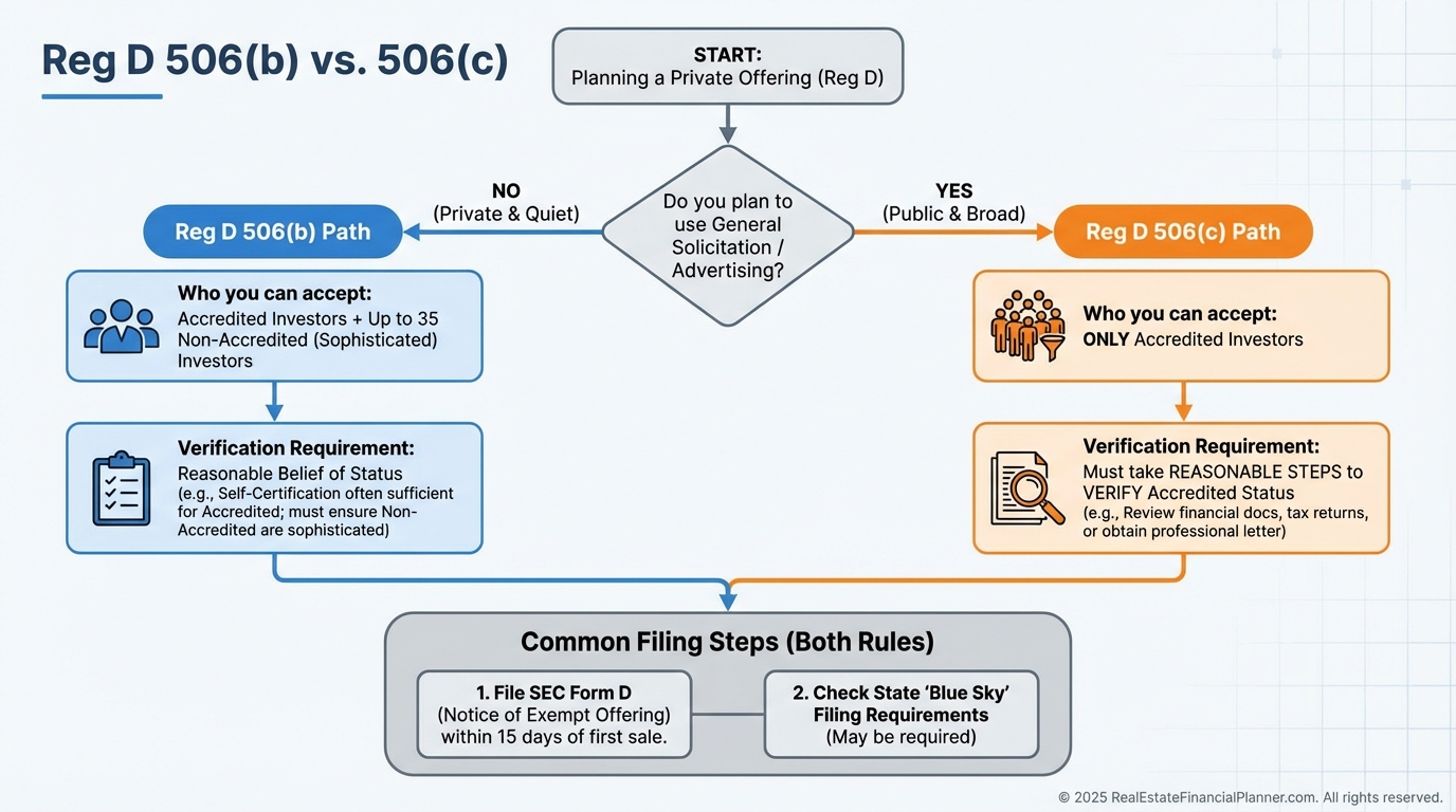 Most syndicators rely on Reg D exemptions—506(b) or 506(c). 506(b) allows up to 35 sophisticated, pre-existing relationships and no general solicitation. 506(c) allows public marketing, but investors must be verified accredited.