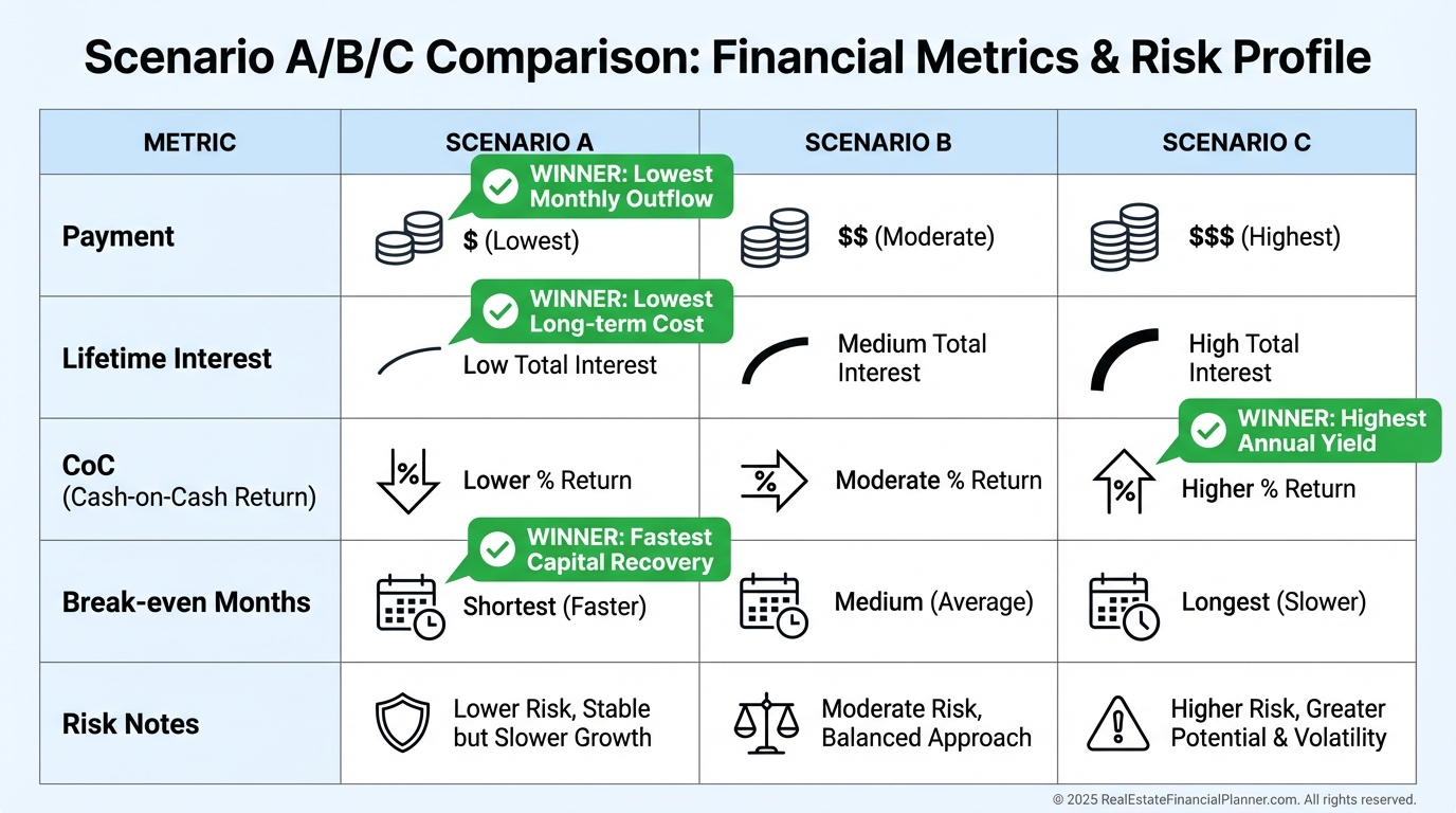 I compare monthly payment differences, lifetime interest saved, cash-on-cash, break-even on the extra down payment, and risk metrics.